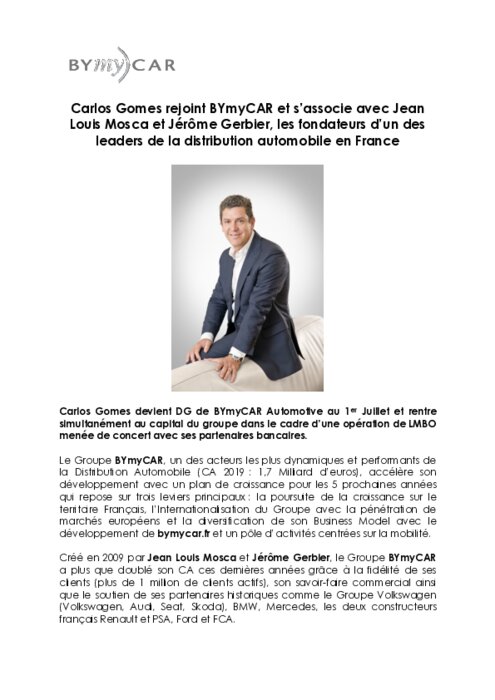 Constructeurs 07 juillet 2020 - 16:50 Carlos Gomes est devenu DG de BYmyCAR Automotive au 1er Juillet et rentre simultanément au capital du groupe dans le cadre d'une opération de LMBO menée de concert avec ses partenaires bancaires. PDF (1 Mo) Télécharger