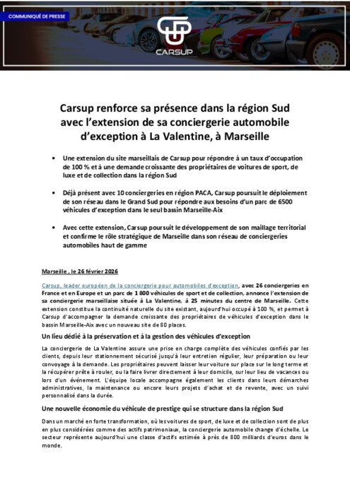 Carsup, leader européen de la conciergerie pour automobiles d’exception, avec 26 conciergeries en France et en Europe et un parc de 1 800 véhicules de sport et de collection, annonce l’extension de sa conciergerie marseillaise située à La Valentine, à 25 minutes du centre de Marseille. Cette extension constitue la continuité naturelle du site existant, aujourd’hui occupé à 100 %, et permet à Carsup d’accompagner la demande croissante des propriétaires de véhicules d’exception dans le bassin Marseille-Aix avec un nouveau site de 80 places.