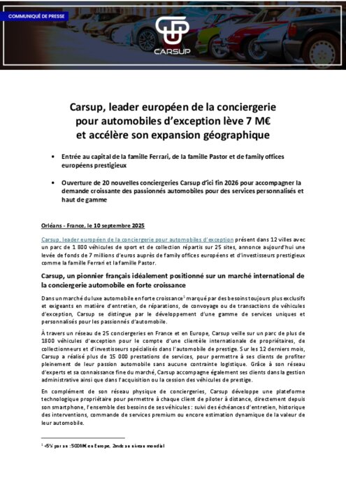Carsup, leader européen de la conciergerie pour automobiles d’exception présent dans 12 villes avec un parc de 1 800 véhicules de sport et de collection répartis sur 25 sites, annonce aujourd’hui une levée de fonds de 7 millions d’euros auprès de family offices européens et d’investisseurs prestigieux comme la famille Ferrari et la famille Pastor.