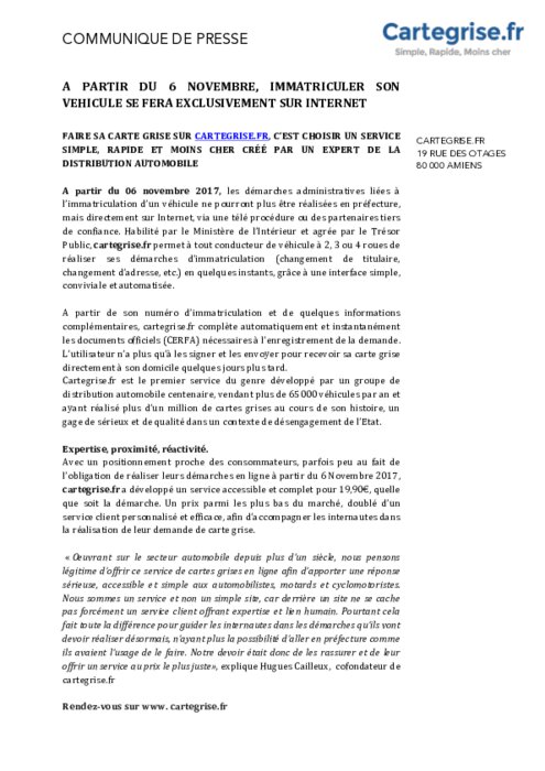 A partir du 06 novembre 2017, les démarches administratives liées à l’immatriculation d’un véhicule ne pourront plus être réalisées en préfecture, mais directement sur Internet, via une télé procédure ou des partenaires tiers de confiance. Habilité par le Ministère de l’Intérieur et agrée par le Trésor Public, cartegrise.fr permet à tout conducteur de véhicule à 2, 3 ou 4 roues de réaliser ses démarches d’immatriculation (changement de titulaire, changement d’adresse, etc.)