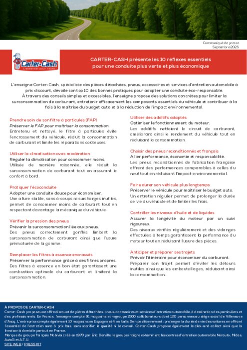 L’enseigne Carter-Cash, spécialiste des pièces détachées, pneus, accessoires et services d’entretien automobile à prix discount, dévoile son top 10 des bonnes pratiques pour adopter une conduite éco-responsable. À travers des conseils simples et accessibles, l’enseigne propose des solutions concrètes pour limiter la surconsommation de carburant, entretenir efficacement les composants essentiels du véhicule et contribuer à la fois à la maîtrise du budget auto et à la réduction de l’impact environnemental.