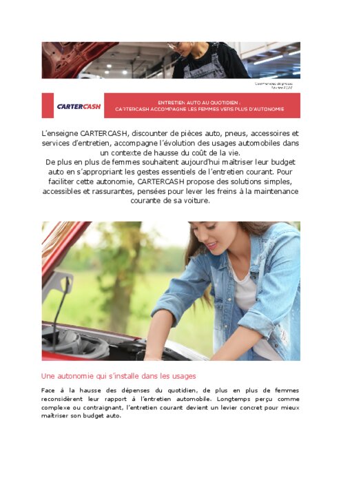 L’enseigne CARTERCASH, discounter de pièces auto, pneus, accessoires et services d’entretien, accompagne l’évolution des usages automobiles dans un contexte de hausse du coût de la vie. De plus en plus de femmes souhaitent aujourd’hui maîtriser leur budget auto en s’appropriant les gestes essentiels de l’entretien courant. Pour faciliter cette autonomie, CARTERCASH propose des solutions simples, accessibles et rassurantes, pensées pour lever les freins à la maintenance courante de sa voiture.