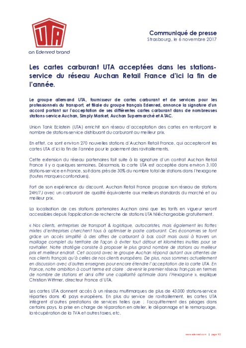 Le groupe allemand UTA, fournisseur de cartes carburant et de services pour les professionnels du transport, et filiale du groupe français Edenred, annonce la signature d'un accord portant sur l'acceptation de ses différentes cartes carburant dans de nombreuses stations-service Auchan, Simply Market, Auchan Supermarché et ATAC.