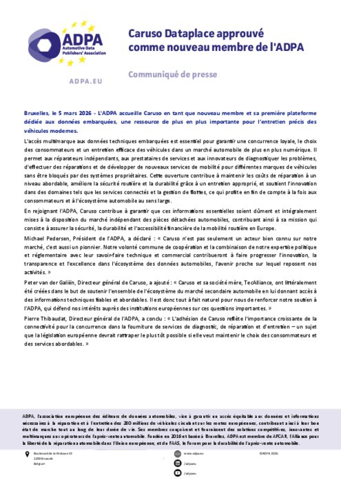 L'association européenne des éditeurs de données automobiles accueille Caruso en tant que nouveau membre et sa première plateforme dédiée aux données embarquées, une ressource de plus en plus importante pour l'entretien précis des véhicules modernes. L'accès multimarque aux données techniques embarquées est essentiel pour garantir une concurrence loyale, le choix des consommateurs et un entretien efficace des véhicules dans un marché automobile de plus en plus numérique. Il permet aux réparateurs indépendants, aux prestataires de services et aux innovateurs de diagnostiquer les problèmes, d'effectuer des réparations et de développer de nouveaux services de mobilité pour différentes marques de véhicules sans être bloqués par des systèmes propriétaires