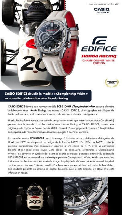 CASIO EDIFICE dévoile son nouveau modèle ECB-S100HR Championship White, sa toute dernière collaboration avec Honda Racing. Les montres CASIO EDIFICE, chronographes métalliques de haute performance, sont basées sur le concept de marque « vitesse et intelligence ». Honda Racing fait référence aux activités de sports motorisés que mène Honda partout dans le monde...