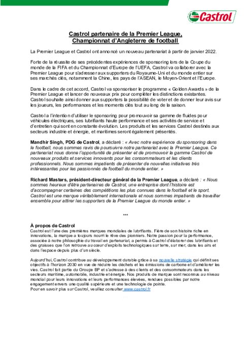 La Premier League et Castrol ont annoncé un nouveau partenariat à partir de janvier 2022. Forte de la réussite de ses précédentes expériences de sponsoring lors de la Coupe du monde de la FIFA et du Championnat d’Europe de l’UEFA, Castrol va collaborer avec la Premier League pour s’adresser aux supporters du Royaume-Uni et du monde entier sur ses marchés clés, notamment la Chine, les pays de l’ASEAN, le Moyen-Orient et l’Europe.
