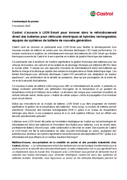 Castrol vient de conclure un partenariat avec LION Smart pour faciliter le développement d’un nouveau module de batterie de pointe pour les véhicules électriques (VE) haute performance. Ce module combinera le système de refroidissement innovant des batteries de LION Smart aux fluides thermiques avancés de Castrol et à son expertise en matière de gestion thermique des batteries.