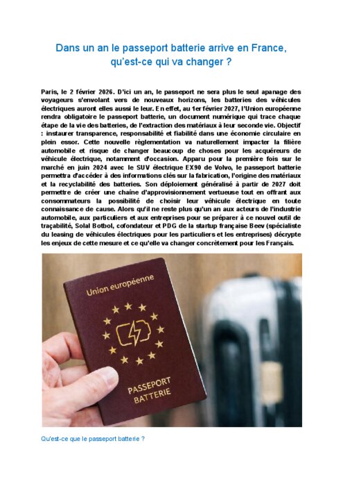Au 1er février 2027, l’Union européenne rendra obligatoire le passeport batterie, un document numérique qui trace chaque étape de la vie des batteries, de l’extraction des matériaux à leur seconde vie. Objectif : instaurer transparence, responsabilité et fiabilité dans une économie circulaire en plein essor. Cette nouvelle règlementation va naturellement impacter la filière automobile et risque de changer beaucoup de choses pour les acquéreurs de véhicule électrique, notamment d’occasion.