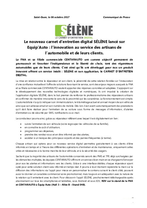 La FNA et sa filiale commerciale CENTARAUTO ont comme objectif permanent de promouvoir et favoriser l'indépendance et la liberté de choix, tant des réparateurs automobiles que de leurs clients. C'est ainsi qu'ils ont développé pour eux un produit innovant offrant un service inédit : SÉLÈNE et son application, le CARNET D'ENTRETIEN DIGITAL.