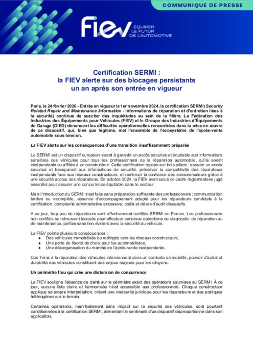 Entrée en vigueur le 1er novembre 2024, la certification SERMI (Security Related Repair and Maintenance Information - Informations de réparation et d'entretien liées à la sécurité) continue de susciter des inquiétudes au sein de la filière. La Fédération des Industries des Équipements pour Véhicules (FIEV) et le Groupe des Industries d’Équipements de Garage (GIEG) dénoncent les difficultés opérationnelles rencontrées dans la mise en œuvre de ce dispositif, qui, bien que légitime, met l'ensemble de l'écosystème de l'après-vente automobile sous tension.