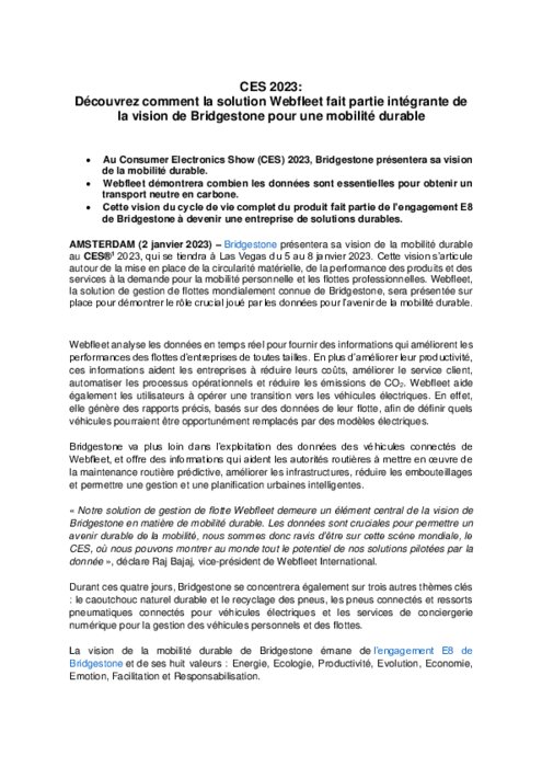 Bridgestone présentera sa vision de la mobilité durable au CES 2023, qui se tiendra à Las Vegas du 5 au 8 janvier 2023. Cette vision s’articule autour de la mise en place de la circularité matérielle, de la performance des produits et des services à la demande pour la mobilité personnelle et les flottes professionnelles.