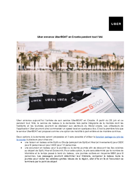 Uber annonce l'arrivée de son service UberBOAT en Croatie. À partir du 26 juin et ce pendant tout l’été, le service de bateau à la demande fera partie intégrante de la manière dont les habitants et les touristes pourront se déplacer aux alentours du littoral croate. Les utilisateurs de l’application Uber pourront ainsi commander un speed boat en quelques clics. C’est la première fois que le service UberBOAT est proposé comme une option de mobilité à part entière et de manière continue.