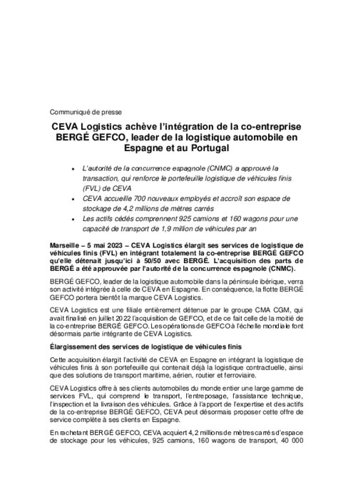 Services 05 mai 2023 - 07:58 Bergé Gefco, leader de la logistique automobile dans la péninsule ibérique, verra son activité intégrée à celle de CEVA en Espagne. En conséquence, la flotte Bergé Gefco portera bientôt la marque CEVA Logistics. PDF (178 Ko) Télécharger