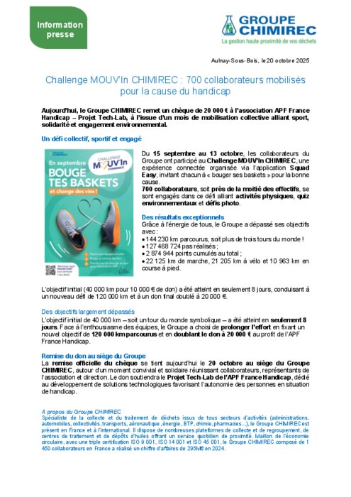 Services 21 octobre 2025 - 11:58 Du 15 septembre au 13 octobre, les collaborateurs du Groupe ont participé au Challenge MOUV’In CHIMIREC, une expérience connectée organisée via l’application Squad Easy, invitant chacun à « bouger ses baskets » pour la bonne cause. PDF (225 Ko) Télécharger credit Chimerec
