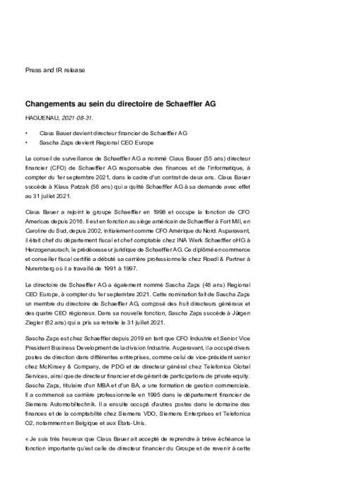 Le conseil de surveillance de Schaeffler AG a nommé Claus Bauer (55 ans) directeur financier (CFO) de Schaeffler AG responsable des finances et de l'informatique, à compter du 1er septembre 2021, dans le cadre d'un contrat de deux ans. Claus Bauer succède à Klaus Patzak (56 ans) qui a quitté Schaeffler AG à sa demande avec effet au 31 juillet 2021. Le directoire de Schaeffler AG a également nommé Sascha Zaps (46 ans) Regional CEO Europe, à compter du 1er septembre 2021...