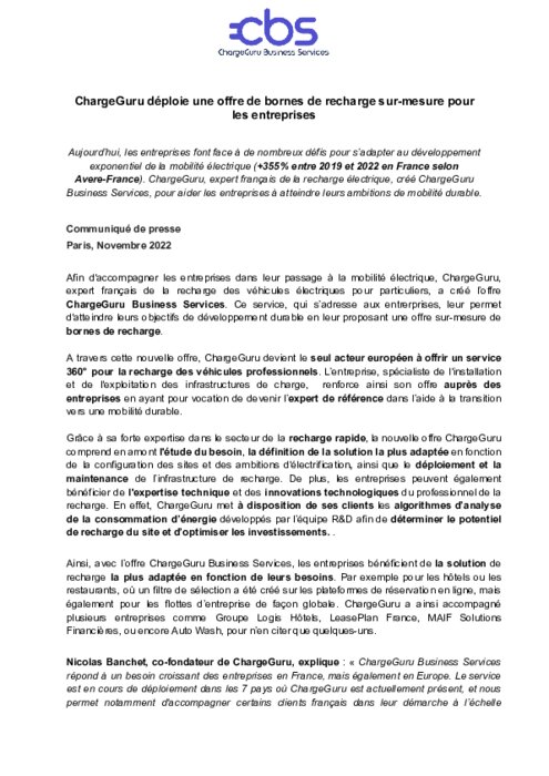 Aujourd’hui, les entreprises font face à de nombreux défis pour s’adapter au développement exponentiel de la mobilité électrique (+355% entre 2019 et 2022 en France selon Avere-France). ChargeGuru, expert français de la recharge électrique, créé ChargeGuru Business Services, pour aider les entreprises à atteindre leurs ambitions de mobilité durable.