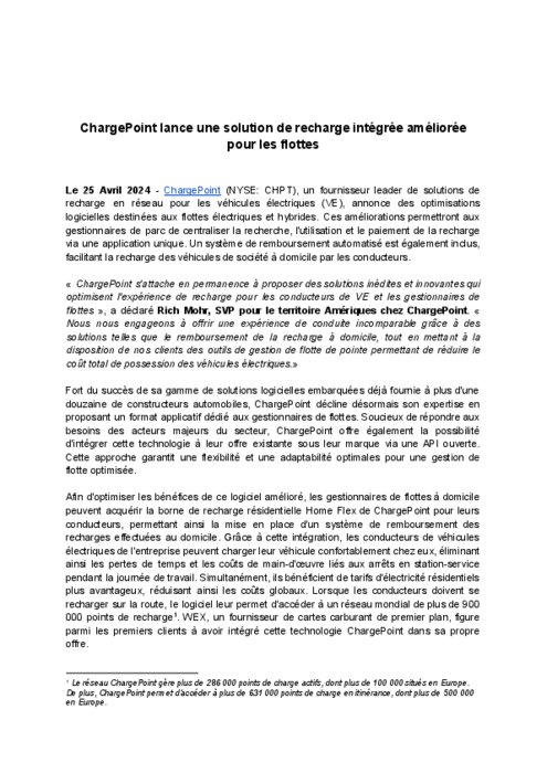 Chargepoint, un fournisseur leader de solutions de recharge en réseau pour les véhicules électriques (VE), annonce des optimisations logicielles destinées aux flottes électriques et hybrides. Ces améliorations permettront aux gestionnaires de parc de centraliser la recherche, l'utilisation et le paiement de la recharge via une application unique. Un système de remboursement automatisé est également inclus, facilitant la recharge des véhicules de société à domicile par les conducteurs.