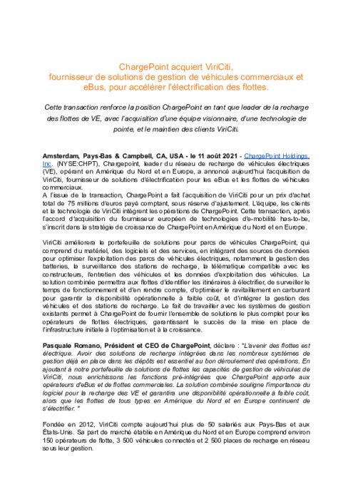 Chargepoint, leader du réseau de recharge de véhicules électriques (VE), opérant en Amérique du Nord et en Europe, a annoncé l'acquisition de ViriCiti, fournisseur de solutions d'électrification pour les eBus et les flottes de véhicules commerciaux. A l’issue de la transaction, ChargePoint a fait l’acquisition de ViriCiti pour un prix d'achat total de 75 millions d'euros payé comptant, sous réserve d'ajustement.
