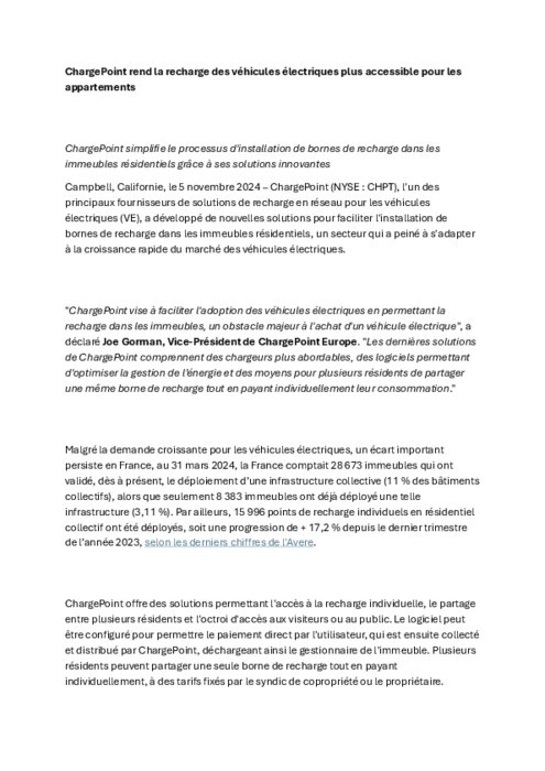 ChargePoint, l'un des principaux fournisseurs de solutions de recharge en réseau pour les véhicules électriques (VE), a développé de nouvelles solutions pour faciliter l'installation de bornes de recharge dans les immeubles résidentiels, un secteur qui a peiné à s'adapter à la croissance rapide du marché des véhicules électriques.