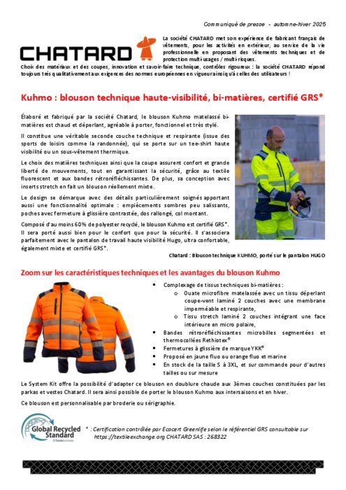Élaboré et fabriqué par la société Chatard, le blouson Kuhmo matelassé bi-matières est chaud et déperlant, agréable à porter, fonctionnel et très stylé. Il constitue une véritable seconde couche technique et respirante (issue des sports de loisirs comme la randonnée), qui se porte sur un tee-shirt haute visibilité ou un sous-vêtement thermique.