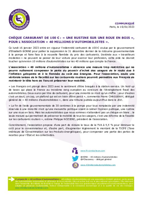 Ce lundi 16 janvier 2023 entre en vigueur l’indemnité carburant de 100 € voulue par le gouvernement d’Elisabeth BORNE pour pallier la suppression le 31 décembre dernier de la ristourne gouvernementale à la pompe et faire face à la nouvelle flambée du prix des carburants. Destinée aux « travailleurs modestes » ne pouvant se passer de leur voiture pour exercer leur profession, cette aide ne devrait toucher qu’environ 10 millions d’automobilistes sur les 40 millions que compte la France.