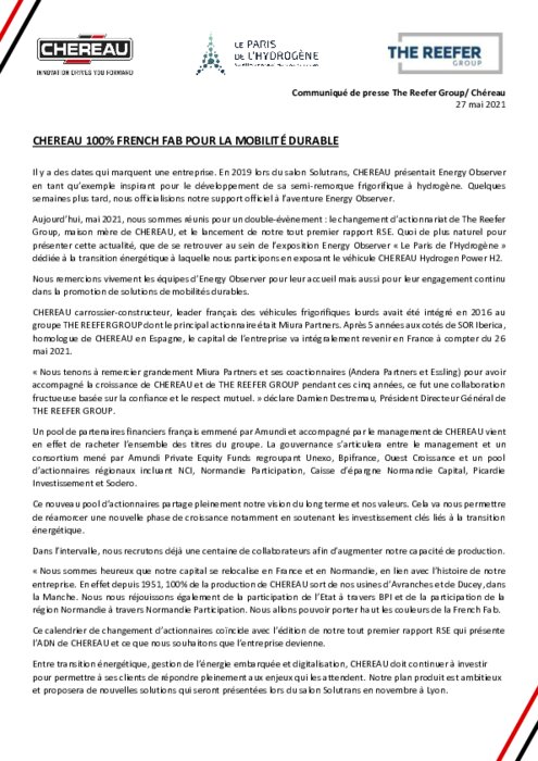Il y a des dates qui marquent une entreprise. En 2019 lors du salon Solutrans, CHEREAU présentait Energy Observer en tant qu'exemple inspirant pour le développement de sa semi-remorque frigorifique à hydrogène. Quelques semaines plus tard, nous officialisions notre support officiel à l'aventure Energy Observer. Aujourd'hui, nous sommes réunis pour un double-évènement : le changement d'actionnariat de The Reefer Group, maison mère de CHEREAU, et le lancement de notre tout premier rapport RSE.