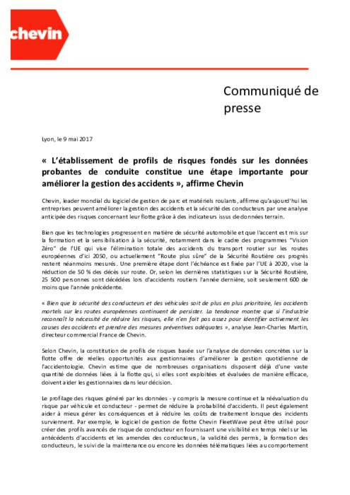 Chevin, leader mondial du logiciel de gestion de parc et matériels roulants, affirme que les entreprises peuvent améliorer la gestion des accidents et la sécurité des conducteurs par une analyse anticipée des risques concernant leur flotte grâce à des indicateurs issus de données terrain. Chevin, la constitution de profils de risques basée sur l'analyse de données concrètes sur la flotte offre de réelles opportunités aux gestionnaires d'améliorer la gestion quotidienne de l'accidentalité...
