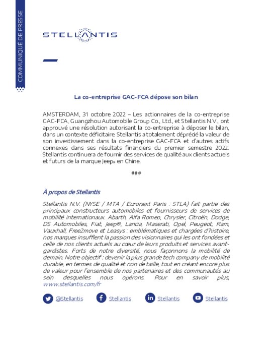 Stellantis avait annoncé en juillet son retrait de cette entreprise faute d'avoir réussi à y prendre une part majoritaire. GAC a précisé de son côté que cette décision des actionnaires avait été prise à l'unanimité.