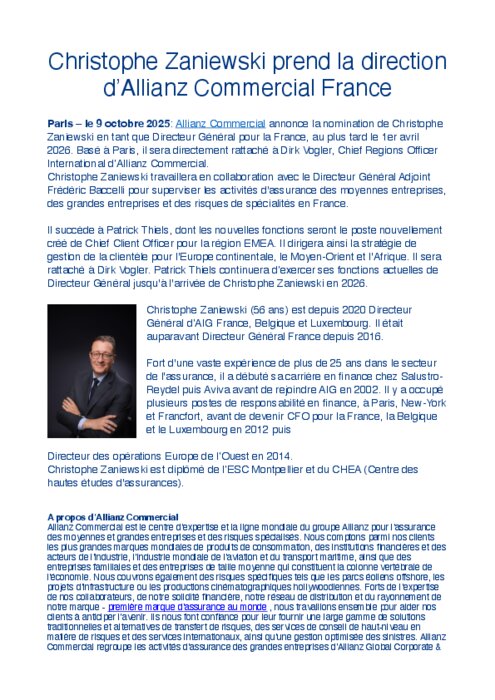 Allianz Commercial annonce la nomination de Christophe Zaniewski en tant que Directeur Général pour la France, au plus tard le 1er avril 2026. Basé à Paris, il sera directement rattaché à Dirk Vogler, Chief Regions Officer International d’Allianz Commercial. Christophe Zaniewski travaillera en collaboration avec le Directeur Général Adjoint Frédéric Baccelli pour superviser les activités d'assurance des moyennes entreprises, des grandes entreprises et des risques de spécialités en France.