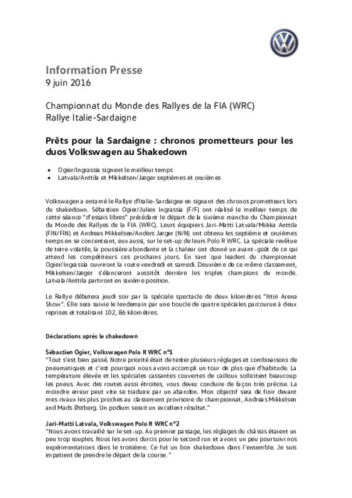 Volkswagen a entamé le Rallye d’Italie-Sardaigne en signant des chronos prometteurs lors du shakedown. Sébastien Ogier/Julien Ingrassia (F/F) ont réalisé le meilleur temps de cette séance "d’essais libres" précédant le départ de la sixième manche du Championnat du Monde des Rallyes de la FIA (WRC). Leurs équipiers Jari-Matti Latvala/Miikka Anttila (FIN/FIN) et Andreas Mikkelsen/Anders Jæger (N/N) ont obtenu les septième et onzièmes temps.