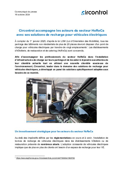 Afin d’accompagner les professionnels du secteur HoReCa dans l’installation d’infrastructures de charge sur leurs parkings et de les aider à répondre aux attentes de leur clientèle actuelle tout en attirant une nouvelle clientèle soucieuse de l’environnement, Circontrol, leader dans le domaine des solutions de recharge pour véhicules électriques, a développé un panel de solutions spécifiquement adaptées aux besoins de ce marché.