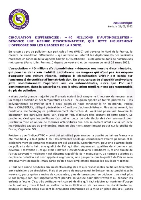 40 MA dénonce une mesure discriminatoire, qui pénalise dans leur mobilité quotidienne les usagers qui n’ont pas les moyens d’acquérir une voiture récente, puisque la classification Crit’air est basée sur l’ancienneté du certificat d’immatriculation. De plus, ce type de dispositif anti-voiture jette volontairement l’opprobre sur les automobilistes, alors que l’on sait pertinemment, dans le cas présent, que la circulation routière n’est pas responsable du pic de pollution.