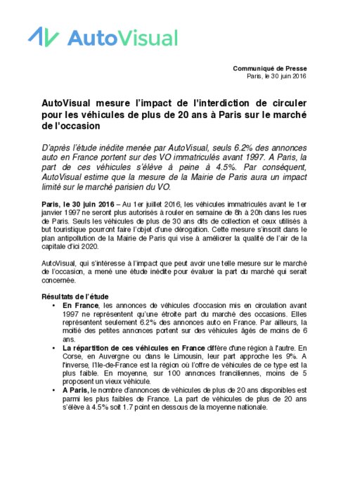 D’après l’étude inédite menée par AutoVisual, seuls 6.2% des annonces auto en France portent sur des VO immatriculés avant 1997. A Paris, la part de ces véhicules s’élève à peine à 4.5%. Par conséquent, AutoVisual estime que la mesure de la Mairie de Paris aura un impact limité sur le marché parisien du VO.