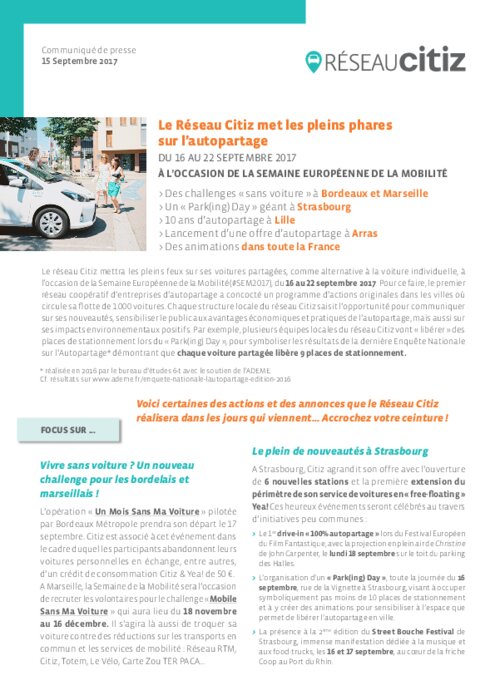 Citiz, le premier réseau d'entreprises coopératives d'autopartage, mettra les pleins feux sur ses voitures partagées, comme alternative à la voiture individuelle, à l'occasion de la Semaine Européenne de la Mobilité (#SEM2017), du 16 au 22 septembre 2017. Pour ce faire, le premier réseau coopératif d'entreprises d'autopartage a concocté un programme d'actions originales dans les villes où circule sa flotte de 1.000 voitures.