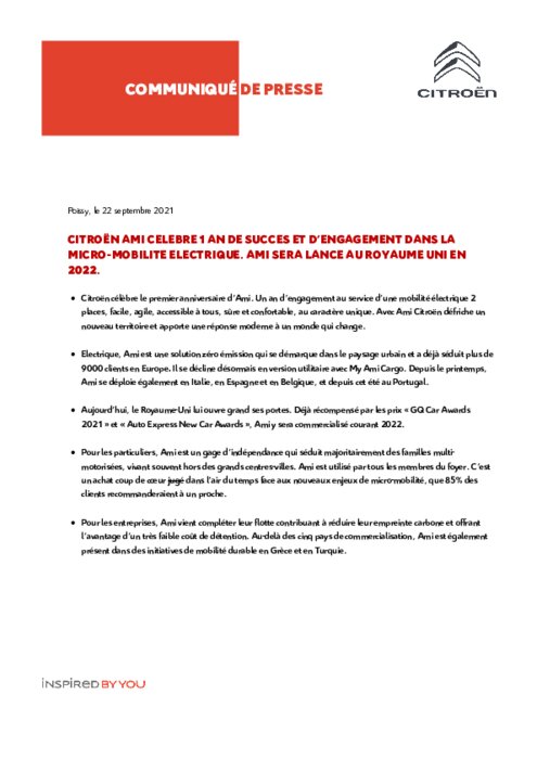 Citroën célèbre le premier anniversaire d’Ami. Un an d’engagement au service d’une mobilité électrique 2 places, facile, agile, accessible à tous, sûre et confortable, au caractère unique. Avec Ami Citroën défriche un nouveau territoire et apporte une réponse moderne à un monde qui change. Aujourd’hui, le Royaume-Uni lui ouvre grand ses portes. Déjà récompensé par les prix " GQ Car Awards 2021 " et " Auto Express New Car Awards ", Ami y sera commercialisé courant 2022.