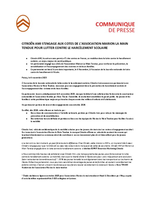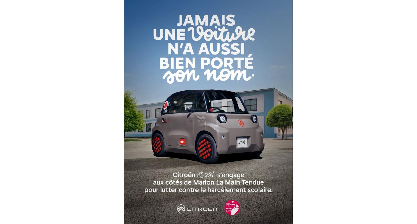 À l’occasion de la Journée nationale de lutte contre le harcèlement scolaire, Citroën Ami annonce son partenariat avec l’association Marion la Main Tendue, reconnue pour son engagement dans la prévention du harcèlement scolaire et l’accompagnement des victimes et de leurs familles.