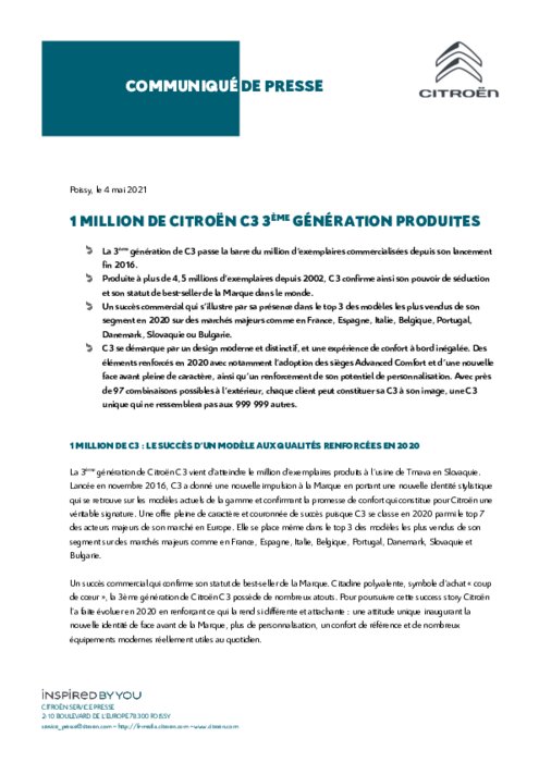 La 3ème génération de Citroën C3 vient d’atteindre le million d’exemplaires produits à l’usine de Trnava en Slovaquie. Lancée en novembre 2016, C3 a donné une nouvelle impulsion à la Marque en portant une nouvelle identité stylistique qui se retrouve sur les modèles actuels de la gamme et confirmant la promesse de confort qui constitue pour Citroën une véritable signature. Une offre pleine de caractère et couronnée de succès...