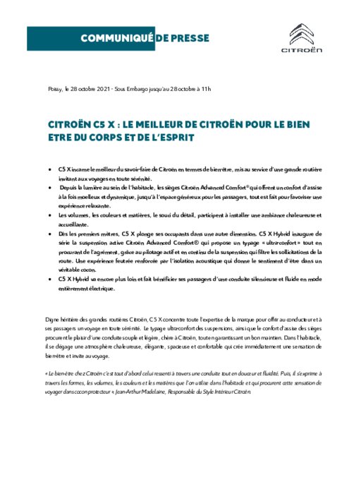 Digne héritière des grandes routières Citroën, C5 X concentre toute l’expertise de la marque pour offrir au conducteur et à ses passagers un voyage en toute sérénité. Le typage ultra-confort des suspensions, ainsi que le confort d’assise des sièges procurent le plaisir d’une conduite souple et légère, chère à Citroën, tout en garantissant un bon maintien. Dans l’habitacle, il se dégage une atmosphère chaleureuse, élégante, spacieuse et confortable qui crée une sensation de bien-être...