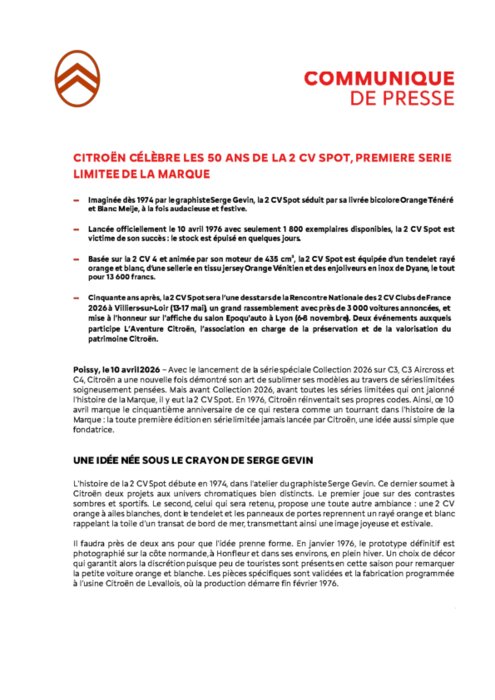 Avec le lancement de la série spéciale Collection 2026 sur C3, C3 Aircross et C4, Citroën a une nouvelle fois démontré son art de sublimer ses modèles au travers de séries limitées soigneusement pensées. Mais avant Collection 2026, avant toutes les séries limitées qui ont jalonné l'histoire de la Marque, il y eut la 2 CV Spot. En 1976, Citroën réinventait ses propres codes. Ainsi, ce 10 avril marque le cinquantième anniversaire de ce qui restera comme un tournant dans l'histoire de la Marque : la toute première édition en série limitée jamais lancée par Citroën, une idée aussi simple que fondatrice.
