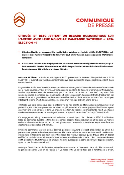 La garantie Citroën We Care est le moyen pour la marque de garantir à ses clients une confiance totale sur la route pour les années à venir. Après la garantie standard de 2 ans, le programme offre jusqu'à 6 années supplémentaires de couverture, pour un total de 8 ans ou 160 000 km, sans frais supplémentaires, à condition que le véhicule soit entretenu au sein du réseau Citroën. L'activation est automatique et la garantie est entièrement transférable si le client vend sa voiture. C'est un moyen intelligent et sans effort de garantir la protection d'un véhicule Citroën à long terme.