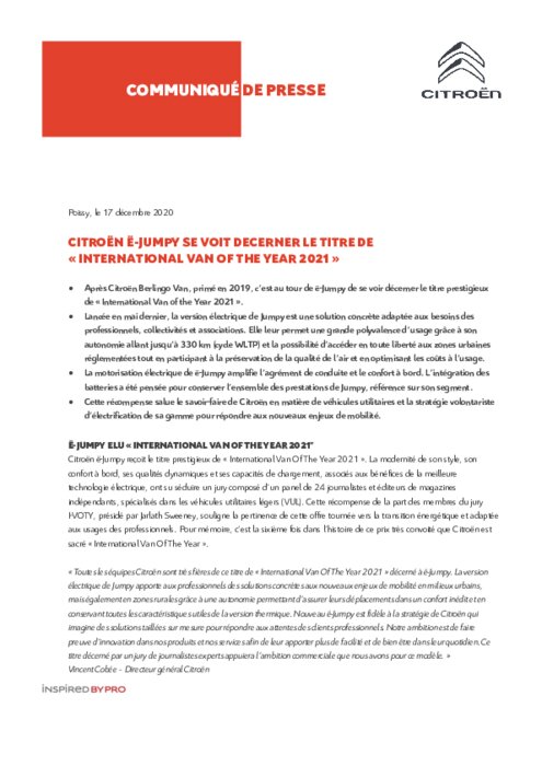 Après Citroën Berlingo Van, primé en 2019, c'est au tour de ë-Jumpy de se voir décerner le titre prestigieux de " International Van of the Year 2021 ". Lancée en mai dernier, la version électrique de Jumpy est une solution concrète adaptée aux besoins des professionnels, collectivités et associations. Elle leur permet une grande polyvalence d'usage grâce à son autonomie allant jusqu'à 330 km (cycle WLTP) et la possibilité d'accéder en toute liberté aux zones urbaines réglementées...