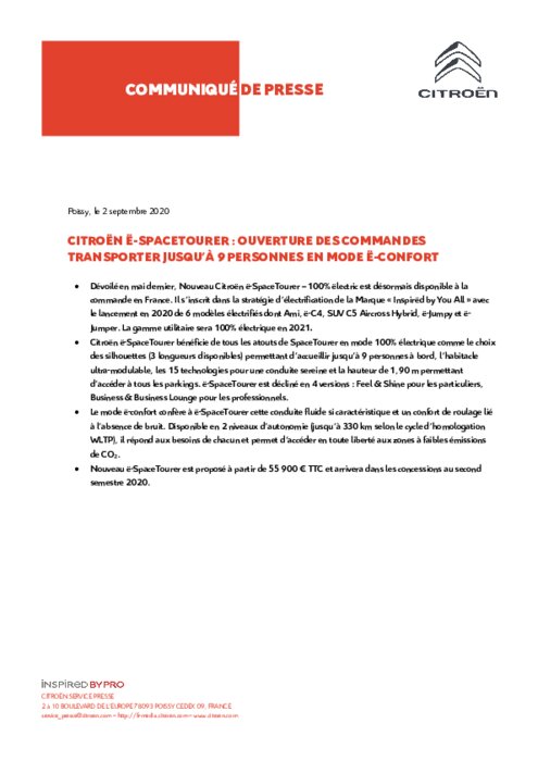 Dévoilé en mai dernier, Nouveau Citroën ë-SpaceTourer – 100% ëlectric est désormais disponible à la commande en France. Il s’inscrit dans la stratégie d’électrification de la Marque "Inspirëd by You All" avec le lancement en 2020 de 6 modèles électrifiés dont Ami, ë-C4, SUV C5 Aircross Hybrid, ë-Jumpy et ë-Jumper.