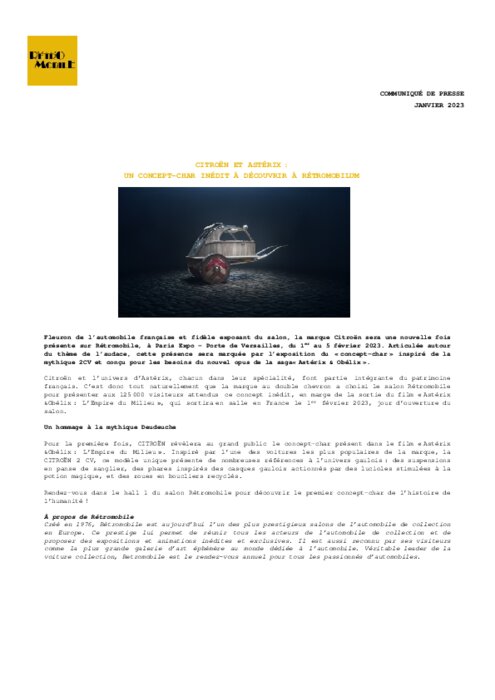 Fleuron de l’automobile française et fidèle exposant du salon, la marque Citroën sera une nouvelle fois présente sur Rétromobile, à Paris Expo – Porte de Versailles, du 1er au 5 février 2023. Articulée autour du thème de l’audace, cette présence sera marquée par l’exposition du « concept-char » inspiré de la mythique 2CV et conçu pour les besoins du nouvel opus de la saga« Astérix & Obélix ».