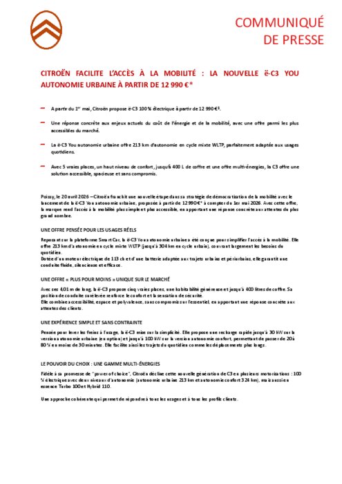 Citroën franchit une nouvelle étape dans sa stratégie de démocratisation de la mobilité avec le lancement de la ë-C3 You autonomie urbaine, proposée à partir de 12 990 €* à compter du 1er mai 2026. Avec cette offre, la marque rend l’accès à la mobilité plus simple et plus accessible, en apportant une réponse concrète aux attentes du plus grand nombre.