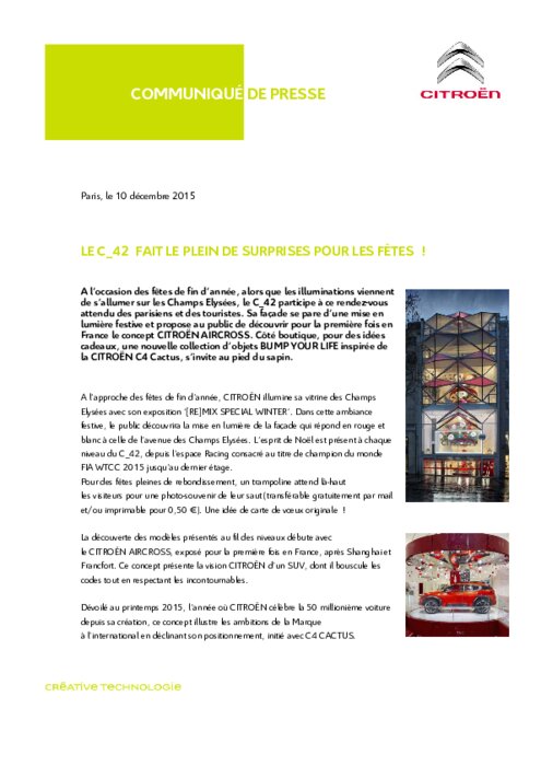 A l’occasion des fêtes de fin d’année, alors que les illuminations viennent de s’allumer sur les Champs Elysées, le C_42 participe à ce rendez-vous attendu des parisiens et des touristes. Sa façade se pare d’une mise en lumière festive et propose au public de découvrir pour la première fois en France le concept CITROËN AIRCROSS. Côté boutique, pour des idées cadeaux, une nouvelle collection d’objets BUMP YOUR LIFE inspirée de la CITROËN C4 Cactus, s’invite au pied du sapin.