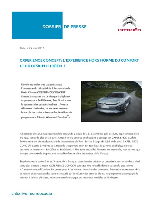 Dévoilé en exclusivité un mois avant l’ouverture du Mondial de l’Automobile de Paris, Citroën CXPERIENCE CONCEPT illustre la capacité de la Marque à déployer sa promesse "Be Different, Feel Good" sur le segment des grandes berlines. Avec sa silhouette distinctive, ce nouveau concept bouscule les codes et incarne les bénéfices du programme "Citroën Advanced Comfort".