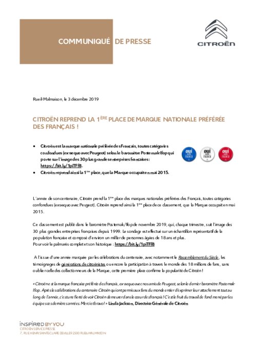 L'année de son centenaire, Citroën prend la 1ère place des marques nationales préférées des Français, toutes catégories confondues (ex-aequo avec Peugeot). Citroën reprend ainsi la 1ère place de ce classement, que la Marque occupait en mai 2015. Ce classement est publié dans le baromètre Posternak/Ifop de novembre 2019, qui, chaque trimestre, suit l'image des 30 plus grandes entreprises françaises depuis 1999. Le sondage est effectué sur un échantillon représentatif de la population française...