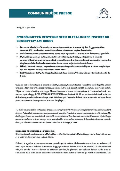 Du concept à la réalité. Citroën répond au succès rencontré par le concept My Ami Buggy présenté en décembre 2021 en dévoilant une édition exclusive, directement inspirée de ce dernier. Seuls 50 exemplaires numérotées seront mis en vente à partir du 21 juin sur le site de vente en ligne dédié. My Ami Buggy présente un tempérament de baroudeur intrépide et sympathique avec sa teinte de carrosserie Khaki ponctuée de jaune acidulé et des éléments de style qui renforcent son caractère.
