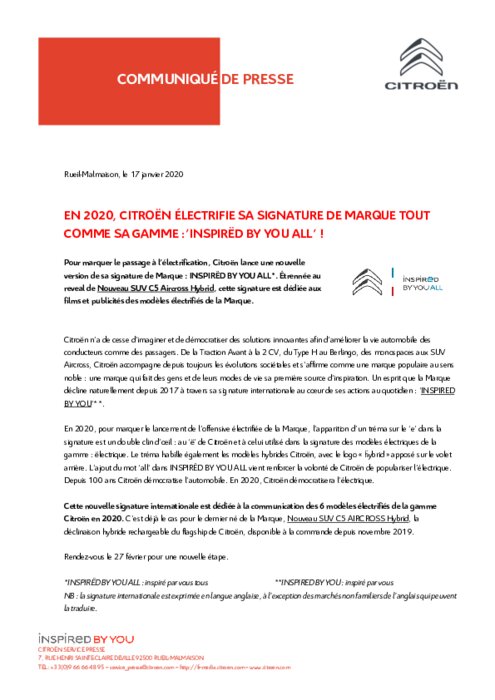 Pour marquer le passage à l'électrification, Citroën lance une nouvelle version de sa signature de Marque : INSPIRËD BY YOU ALL. Étrennée au reveal de Nouveau SUV C5 Aircross Hybrid, cette signature est dédiée aux films et publicités des modèles électrifiés de la Marque.