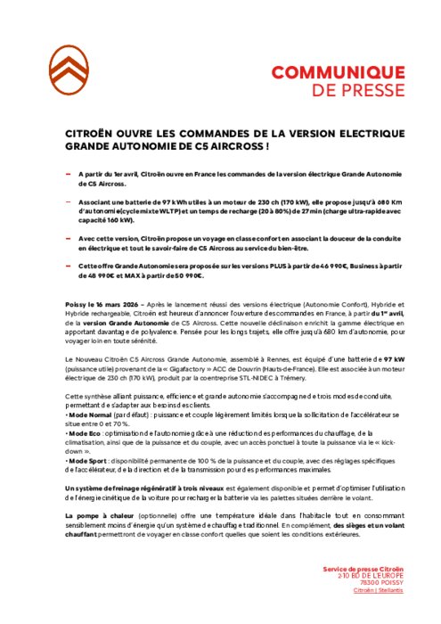 Après le lancement réussi des versions électrique (Autonomie Confort), Hybride et Hybride rechargeable, Citroën est heureux d’annoncer l’ouverture des commandes en France, à partir du 1eravril,de la version Grande Autonomie de C5 Aircross. Cette nouvelle déclinaison enrichit la gamme électrique en apportant davantage de polyvalence. Pensée pour les longs trajets, elle offre jusqu’à 680 km d’autonomie, pour voyager loin en toute sérénité.